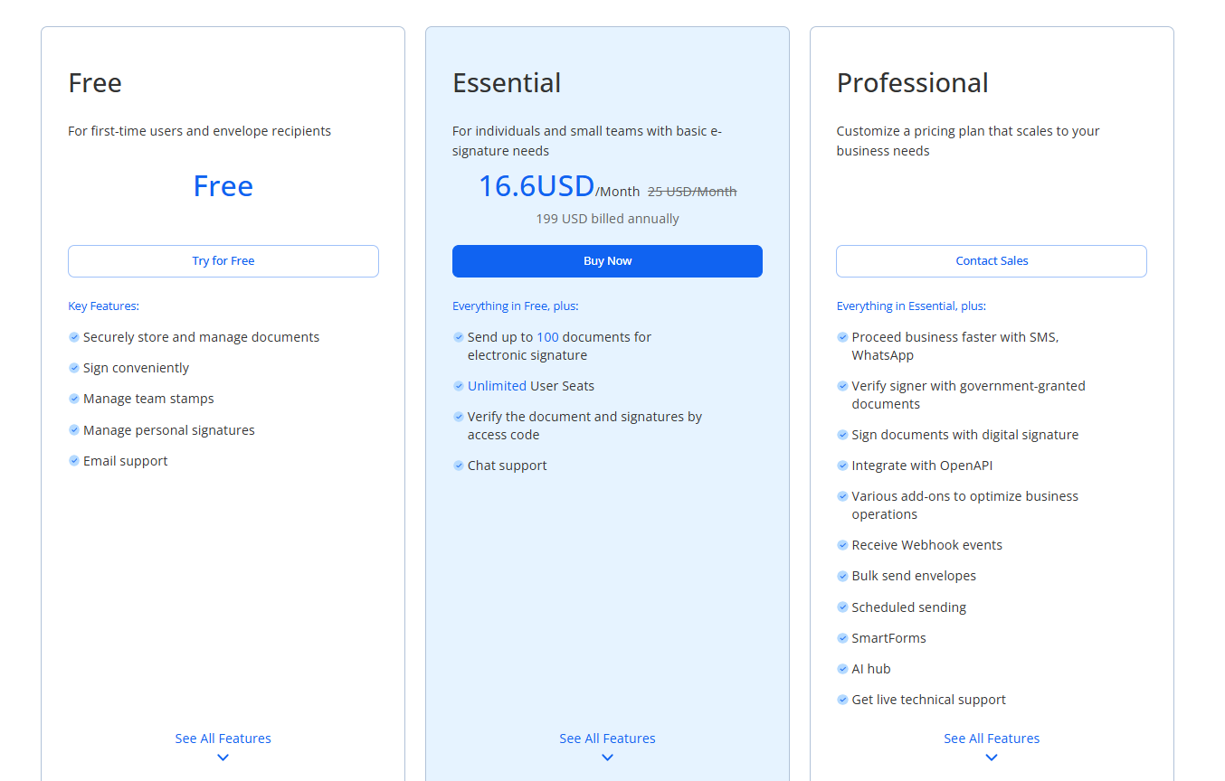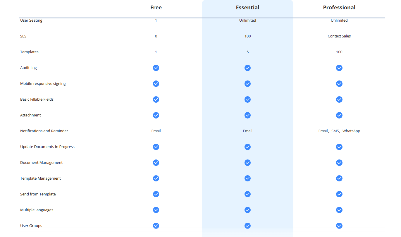 l 基础版(Essential):单价 $199 / 年,提供文件发起、签署、基础管理等核心能力,适配中小企业轻量化需求。根据功能清单,基础版支100份/年的签署额度,满足小规模签署场景,无需额外采购高级功能。