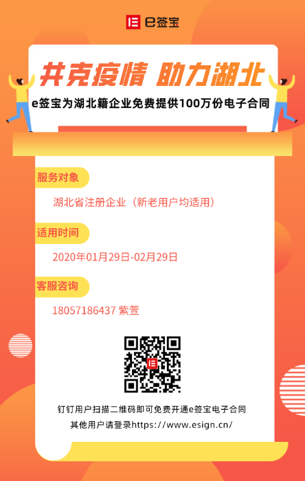 为抗击疫情,共克时艰,e签宝决定为湖北省注册企业免费提供100万份电子合同,自2020年1月29日至2月29日,湖北省企业不论新老用户都可免费申领。