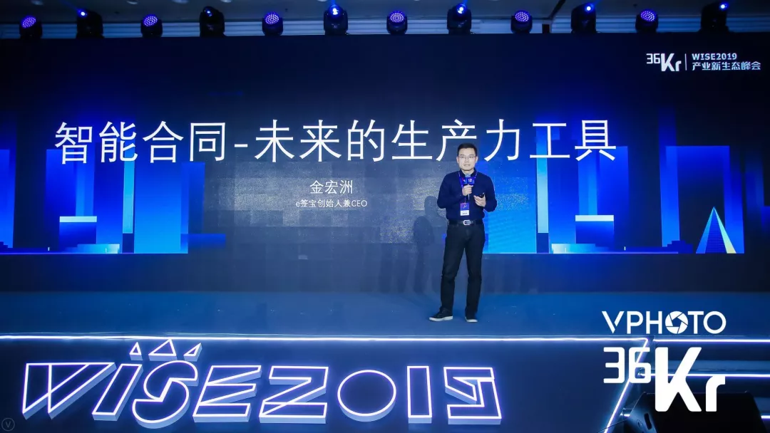 e签宝创始人兼CEO金宏洲在WISE2019产业新生态峰会上,以《智能合同——未来的生产力工具》为题进行了演讲。