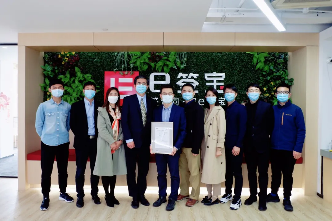 4月22日上午,英国标准协会(BSI)大中华区一行来到e签宝位于杭州天堂软件园的总部,向不久前成为中国电子签名行业第一家获得ISO/IEC 27701认证的e签宝,现场表示祝贺和授牌。