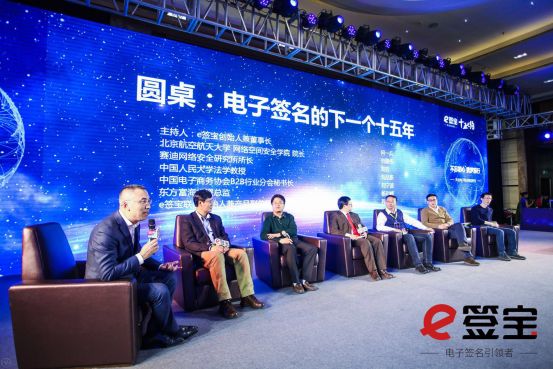 现场众位嘉宾也针对“电子签名的下一个15年”展开了圆桌讨论,从电子签名技术的发展方向、应用场景的展望、电子签名与大数据、电子签名与信用体系建设多个议题共同探讨了电子签名行业的未来。