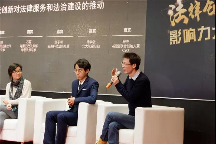 本次圆桌会议的议题是“科技创新对法律服务和法治建设的推动”,程亮与阿里巴巴法务部高级法务专家石磊、支付宝公司法律政策研究专家金嬿等多位业内人士上台交流。
