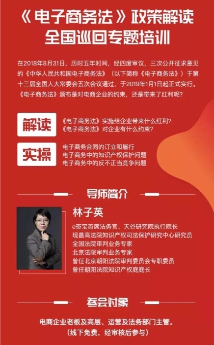 目前,中国已成为全球电子商务发展快、市场大的国家,随着《电子商务法》的出台,这也意味着我国的电子商务领域进入有法可依的阶段。那么,电商企业究竟如何避免踩坑?哪些条款又暗示了企业今后的发展利好,e签宝《电子商务法》政策解读全国巡回专题培训就给出了答案。