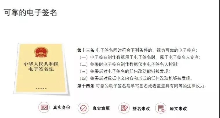 法条:《电子商务法》规定,电子合同和书面合同具有同等法律效力,电子合同中可以使用电子签名。而《中华人民共和过电子签名法》规定,只要具备真实身份、真实意愿、签名未改、合同原文未改4个条件,这份电子合同及其电子签名就合法有效。