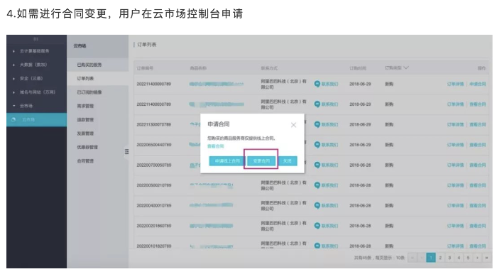 电子合同是云市场推出的一个重要功能。用户在云市场服务商店铺购买商品后,可以在阿里云用户控制台直接向服务商申请电子版线上合同。申请成功后,用户可以下载加盖服务商电子签章的商品售卖合同。
