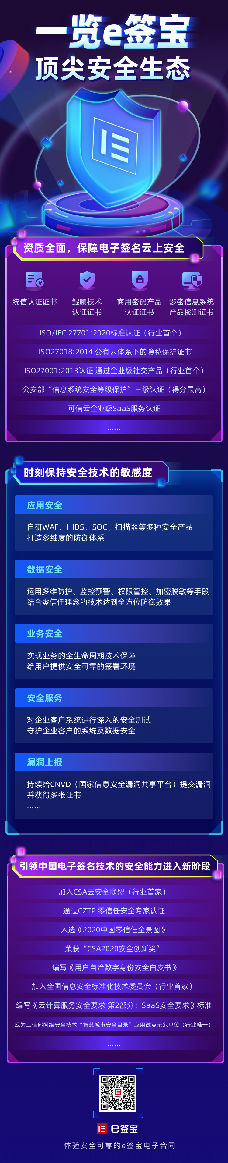 作为中国互联网电子签名行业领跑者,e签宝一直深入贯彻落实《国家安全法》《网络安全法》《电子签名法》《密码法》《标准化法》等法律法规要求,拥有业内领先的安全能力和隐私保护能力,致力于打造出“安全可靠”的电子签名平台。