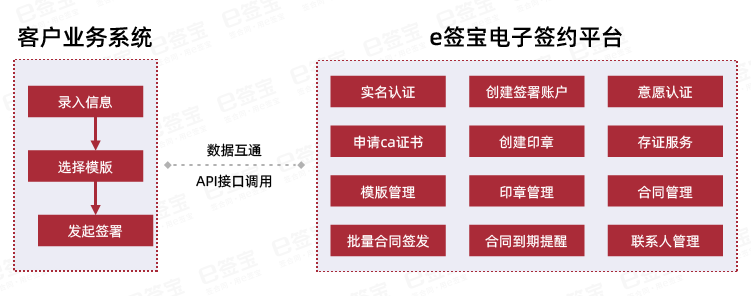 基于企业业务系统,以API接口方式调用e签宝各项服务并进行数据互通,完成电子合同的签署。
