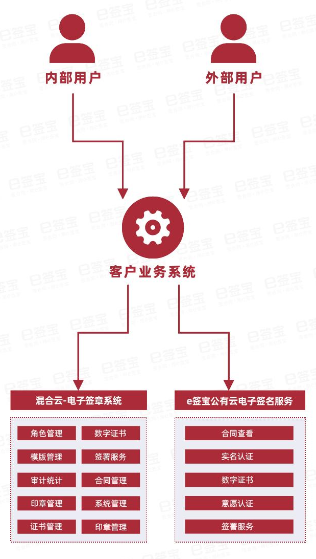 e签宝为用户进行专业化后台管理系统和签章系统部署,对接e签宝公有云电子签名服务,既满足用户核心数据不出本地的需求,也满足用户需要与企业外部人员无障碍顺畅签署的需求。