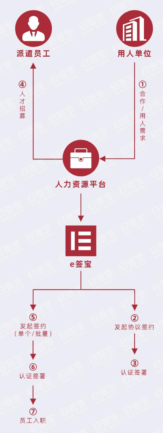 人力资源平台为用人单位进行劳务派遣时,人力资源平台、用人单位、派遣员工之间可以通过e签宝签署三方协议,人力资源平台发起合同签署请求,用人单位和派遣员工作为签署任务接收方,共同完成签署。