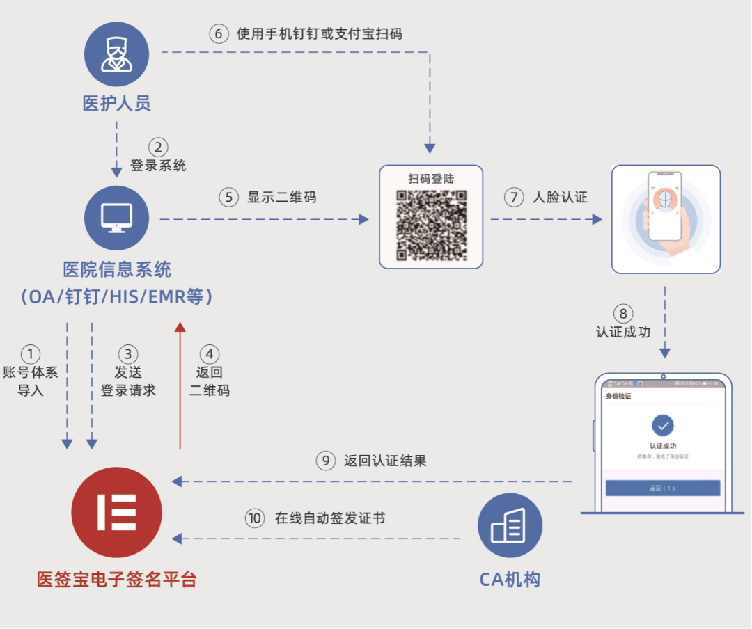 医护人员登录医院信息系统——通过医签宝电子签名平台调取系统登录二维码——医护人员扫码完成实名认证认证——CA机构通过医签宝电子签名系统为医护人员在线自动签发数字证书。