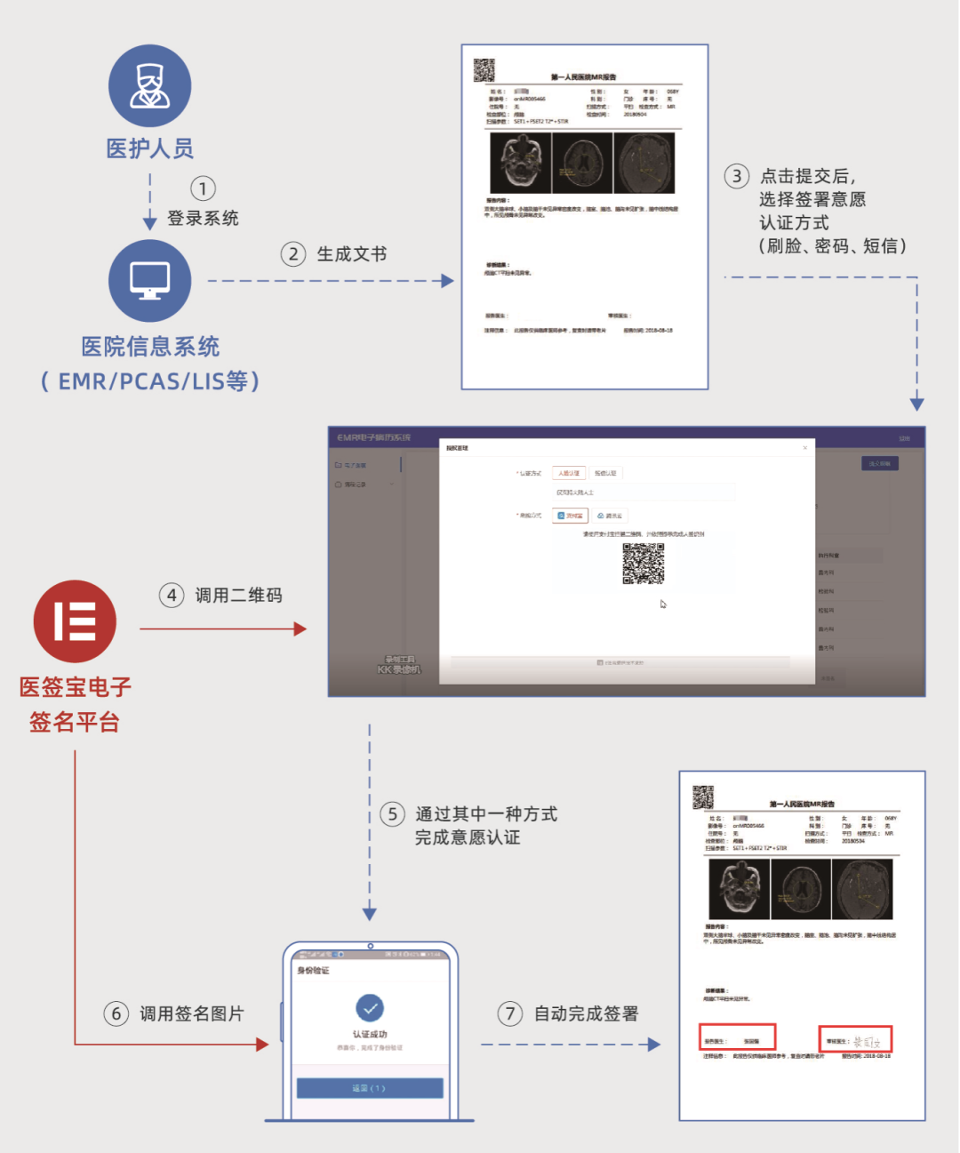 医护人员登录医院信息系统——生成待签署文书——医护人员点击提交,并选择签署的意愿认证方式(刷脸/密码/短信)——医签宝电子签名平台调用签署二维码——医护人员完成意愿认证后,系统自动完成签署。