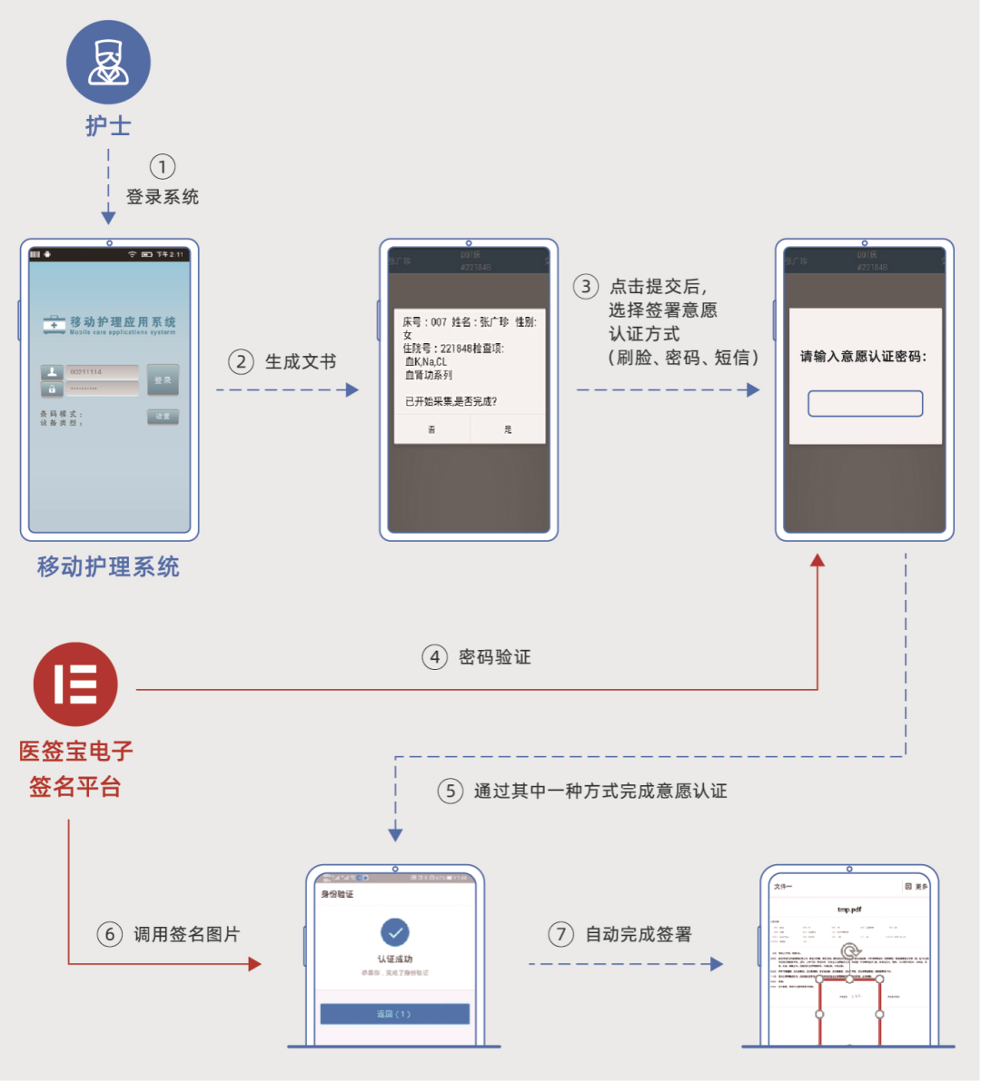 护士登录医院移动护理系统——生成待签署文书——护士点击提交后,选择签署意愿认证方式(刷脸/密码/短信)——意愿认证完成后,自动完成签署。