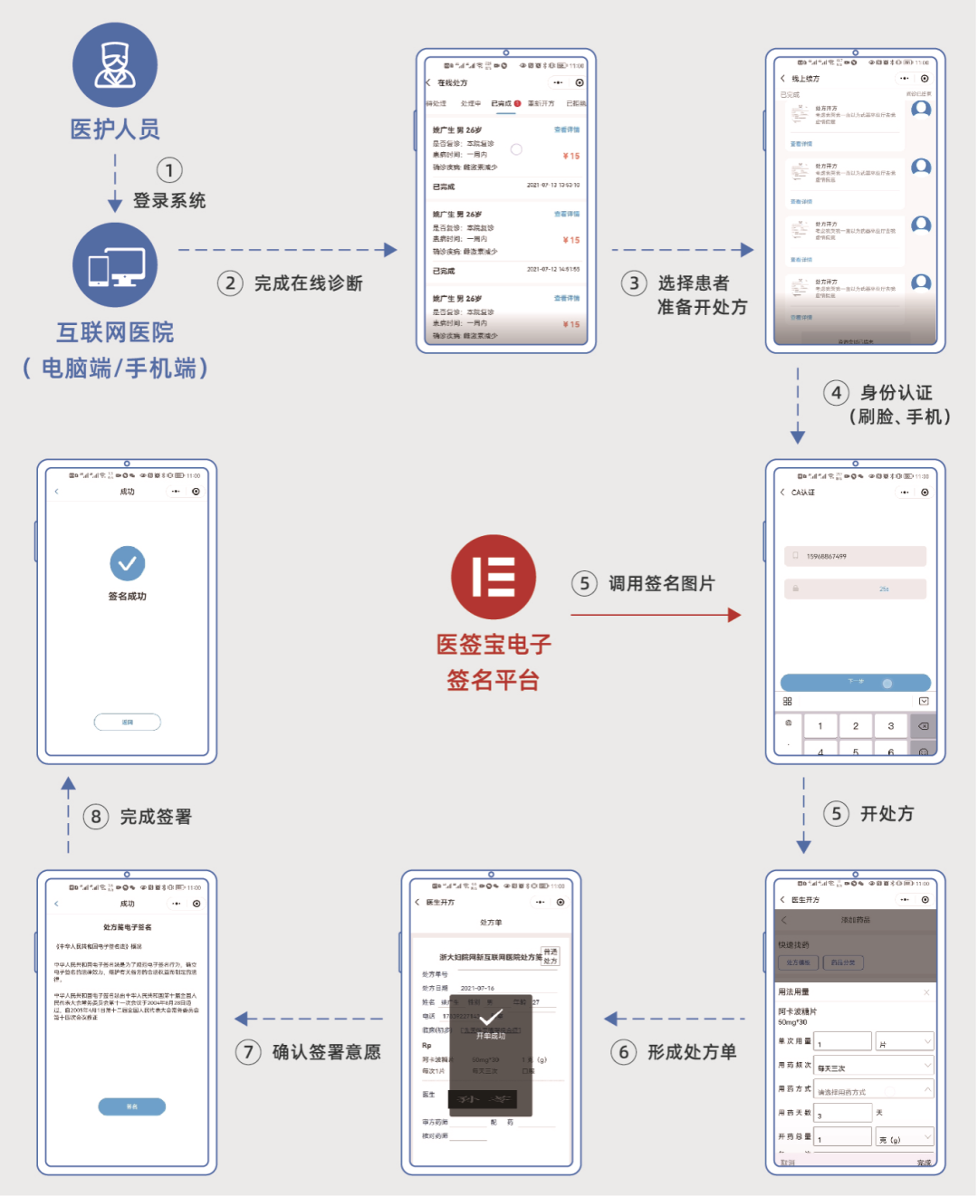 医护人员在电脑端或手机端登录互联网医院——完成在线诊断——选择患者准备开处方单——完成身份认证,并在线开具处方单——确认签署意愿后完成签署。