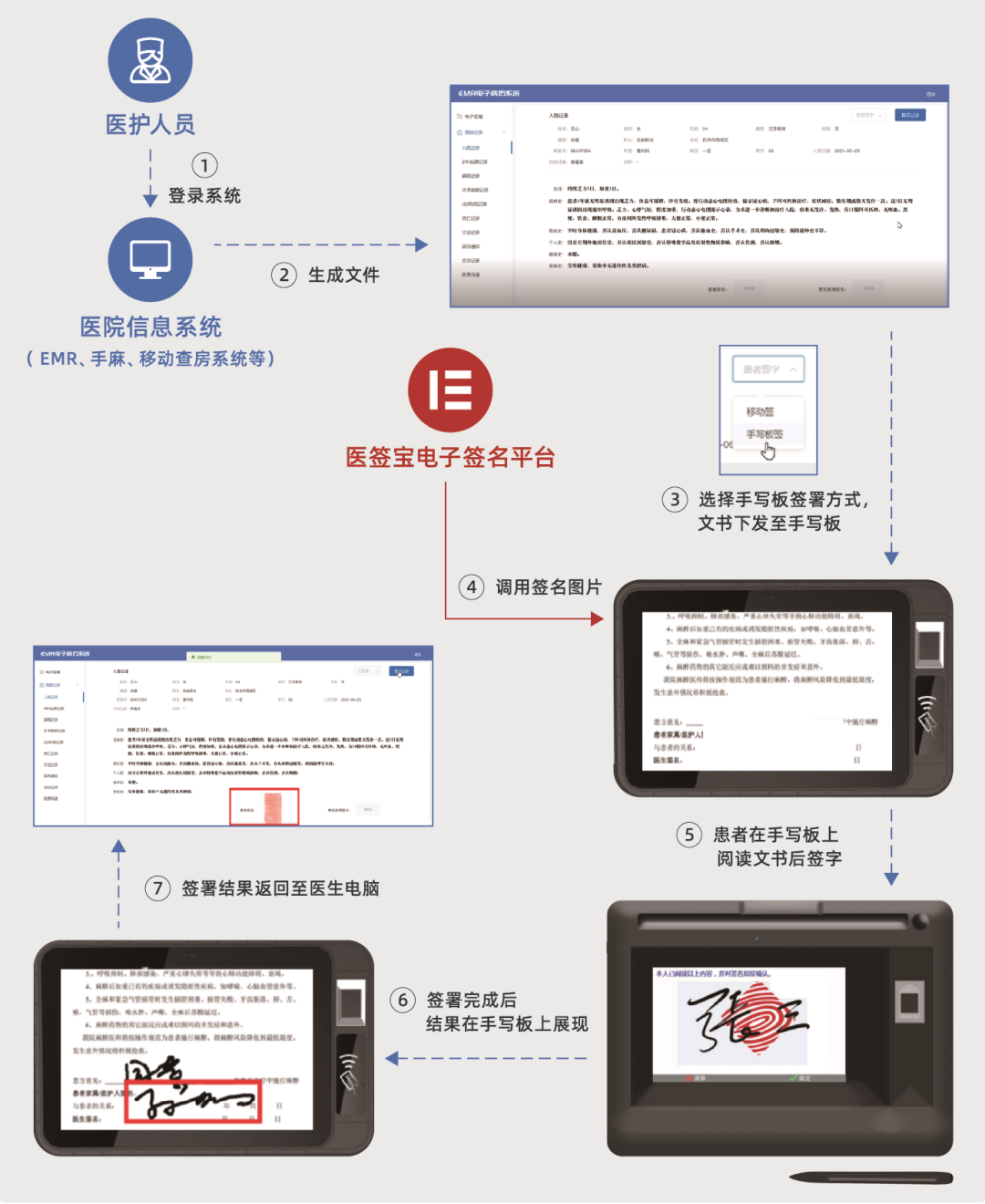 医护人员登录医院信息系统——生成待签署文件——医护人员选择手写板的签署方式,系统将文书下发至手写板——患者在手写板上阅读文书后签字——签署结果展现在手写板上,同时回传至医生的电脑上。