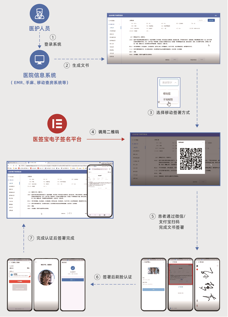 医护人员登录医院信息系统——生成待签署文件——医护人员选择移动签署方式——系统通过医签宝电子签名平台调用二维码——患者通过微信/支付宝扫码在文书上签署——签署后进行刷脸认证——签署完成。