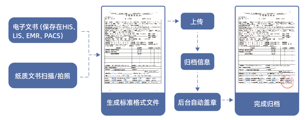将医院信息系统中的电子病历,或者将纸质文书扫描/拍照——生成标准格式的文件——上传并填写归档信息——后台自动盖章并完成归档。