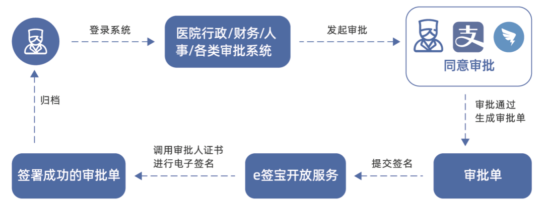 工作人员登录医院行政/财务/人事及各类审批系统——发起审批——审批人通过审批,审批单自动完成签名——归档。