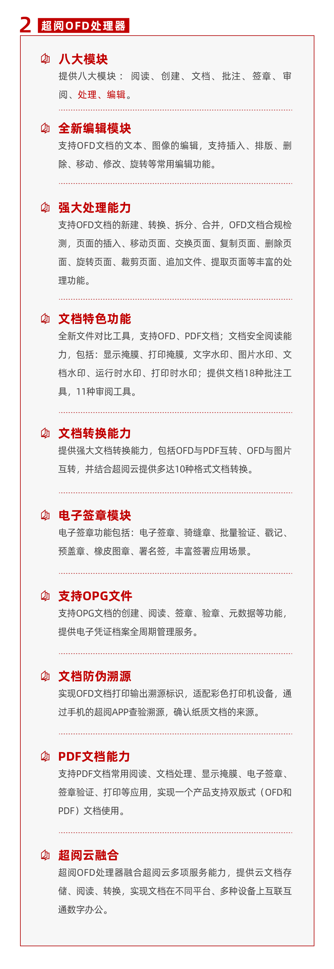 全新升级的超阅OFD处理器,在原有的OFD文档创建、阅读、批注、签章、审阅等功能基础上,新增编辑、处理功能,支持对OFD文档的文本、图像进行插入、排版、删除、移动、修改、旋转等常用编辑功能。
