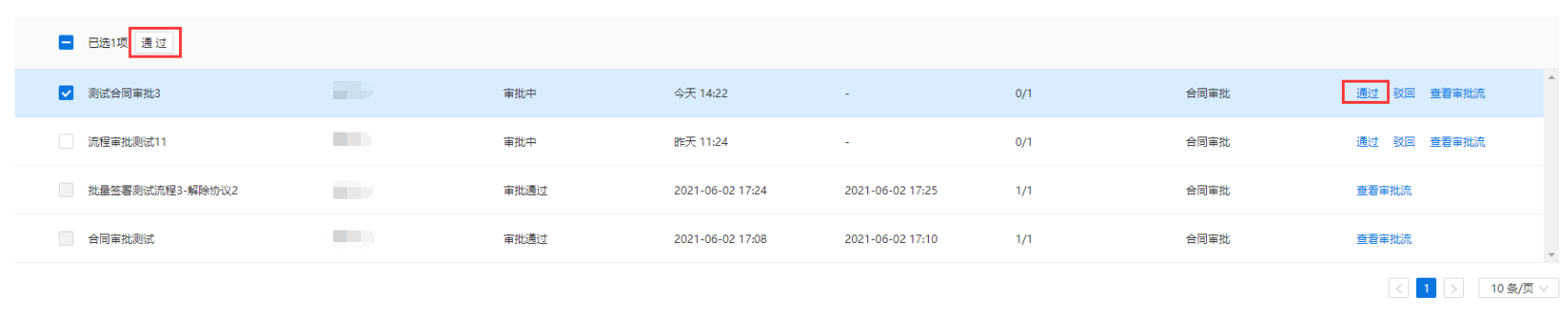 1、单条审批通过:勾选需要通过的审批流程,点击【通过】