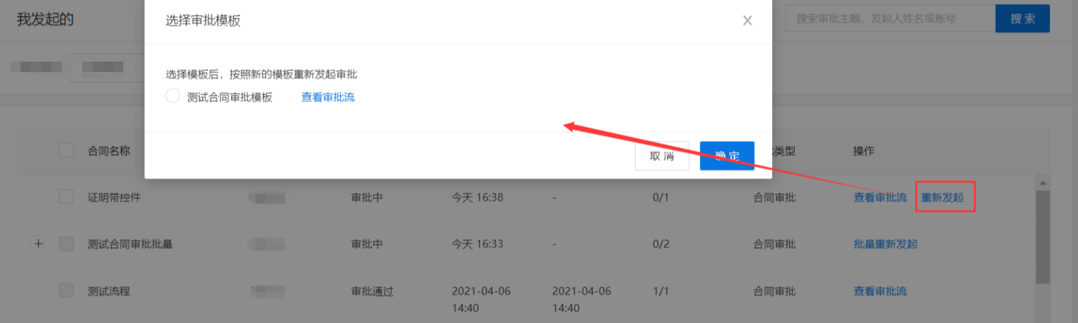 支持单条和批量重新发起,点击【重新发起】,选择对应的合同审批模板