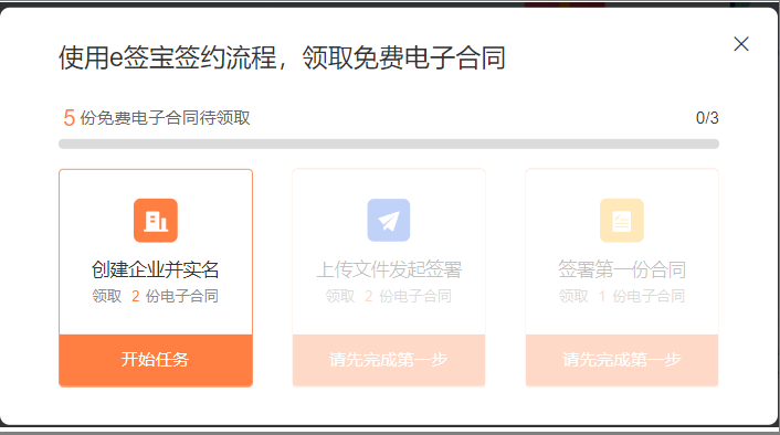 具体地,用户完成实名认证之后,可以免费领取CA数字证书,以及专属的电子印章。另外,e签宝的新用户注册,可以免费领取5份电子合同。用户完成实名登录e签宝官网【esign.cn】之后,点击【我要领取】,打开新手任务详情,每完成一个任务,即可获得相应的合同份数。