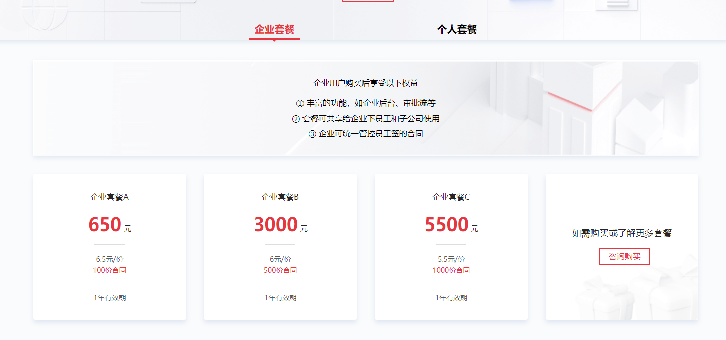 企业客户的收费标准,其收费以用户的签名次数、签署类型和使用周期计费,根据实际情况设计不同的套餐,大致可以分为三档: