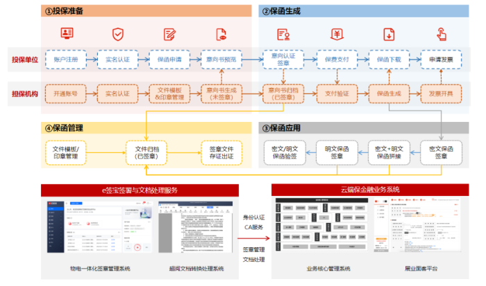 e签宝与云端保已合作服务多个金融担保类用户,涵盖银行、保险、担保公司等,具备成熟的产品方案与交付落地经验,可帮助用户更好更快地完成系统建设