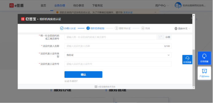 投保单位与金融机构内部用户,均可采用实名身份认证的方式登录保函业务平台,保障用户身份真实安全。其中,投保单位可通过e签宝门户自助进行企业账号实名认证,并按需申领Ukey或移动CA,并通过门户进行企业内印章、证书的统一管理。担保机构内部用户,则可以通过天印电子签章系统,管理组织机构及实名信息,对接云端保业务平台,进行登录使用。