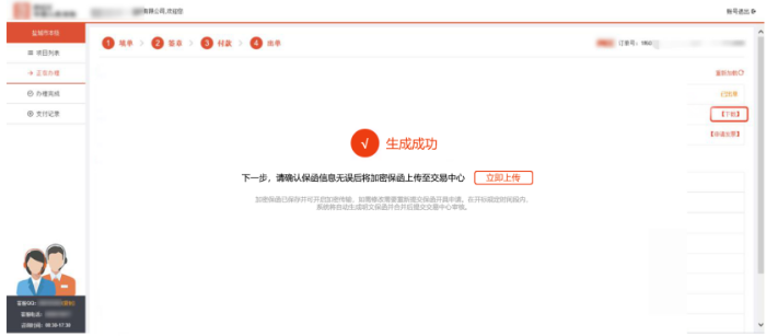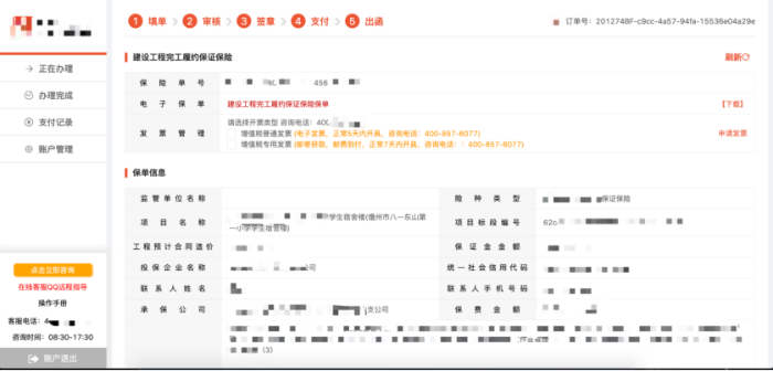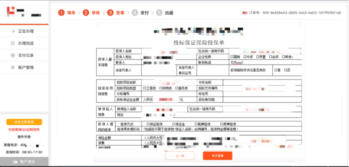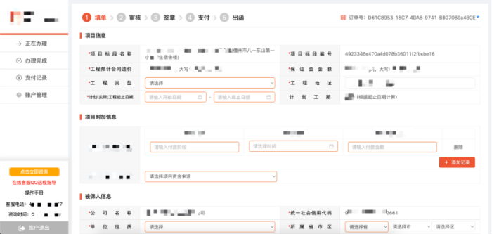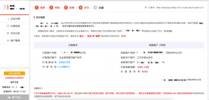 投保单位完成投保单的填写、签章后,需要通过云端保业务平台对投保信息再次进行核验,确认无误后,在线支付电子保函服务费用。该订单将通过云端保系统流转至担保机构。