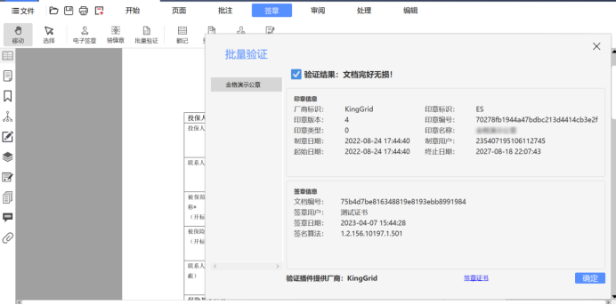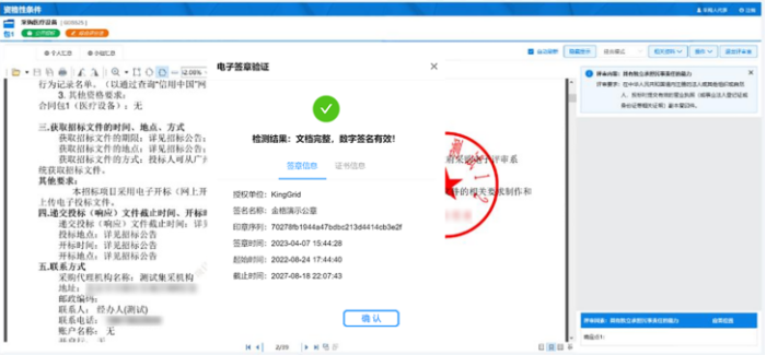 项目开标时,评标人员可借助e签宝验签、验真能力,对电子保函文件的盖章时间、有效性进行查验,确保保函文件信息未被篡改,担保机构与投保人均认可其中的内容,并对所提供的保函信息负责,以保证招投标流程严谨合规。