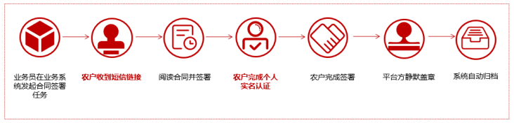 业务员在农户家中,通过业务平台软件发起签署任务,农户手机收到短信签署链接,完成个人实名后签署合同,平台盖项目公司印章。