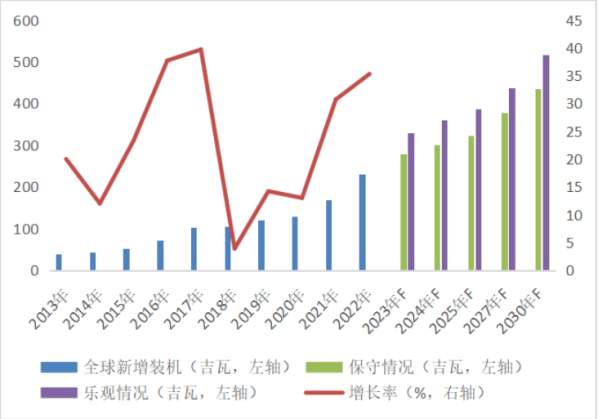 全球:2013年以来的新增装机容量及至2030年装机量预测图