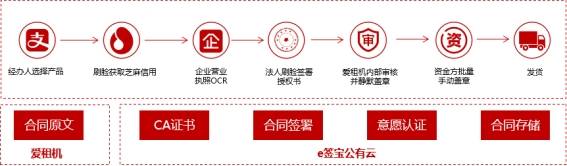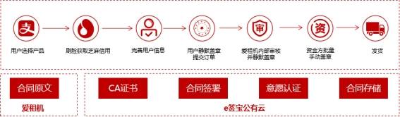 个人用户进入爱租机APP或者是支付宝爱租机小程序,选择自己要租赁的产品,完善信息,完成信用评估并刷脸确认,用户确认订单并静默签署租赁协议,征信授权书以及用户担保合同,爱租机静默签署盖章,资金提供方印章使用员在官网进行批量签署,使用短信验证码完成意愿认证。用户提交爱租机审核。审核通过之后用户支付首期租金,爱租机发货租赁产品。