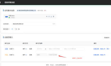可以选择单条或者多条数据发起合同签署,选择好后会跳转到信息采集发起页面,选择好的签署方中会自动带入收集好的信息,页面中继续设置其他签署方信息,设置好后,点击页面中【直接发起】即可。
