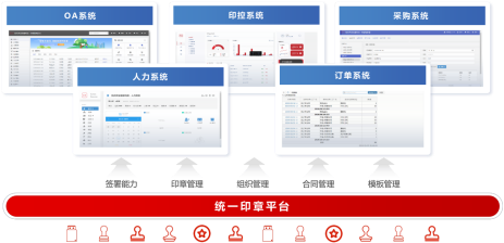 通过搭建统一印章平台来实现签署能力中台化,将签署相关的核心功能由统一印章平台集中赋能各业务系统,实现企业全局的签署、印章、组织、合同、模板能力统一,打破烟囱式建立带来的数字化转型困局