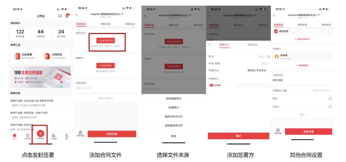 5. 对方签署己方发送完合同,对方收到签署提醒后,进入签署页面。浏览完合同内容,只需添加电子签名或印章,通过实名认证,充分表达签署意愿,即可完成签署。e签宝电子合同也会通过CA机构自动颁发CA证书。合同发起方可全程在后台随时查看合同进度,进行催办、续签等操作。