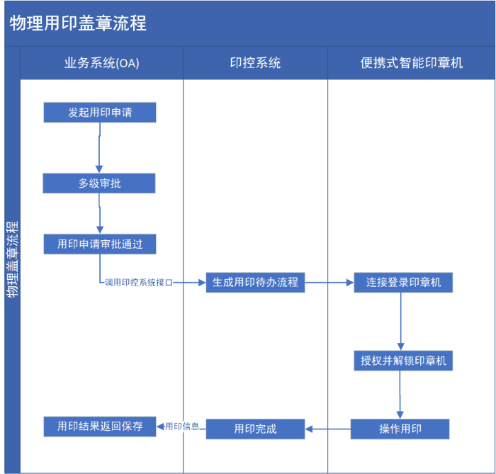 美亚旅游内部用印采用的是思格特物理印控,与致远OA系统对接。由用印员在OA系统提交用印申请,完成后解锁印章机进行用印,用印完成把用印文件回传到OA。