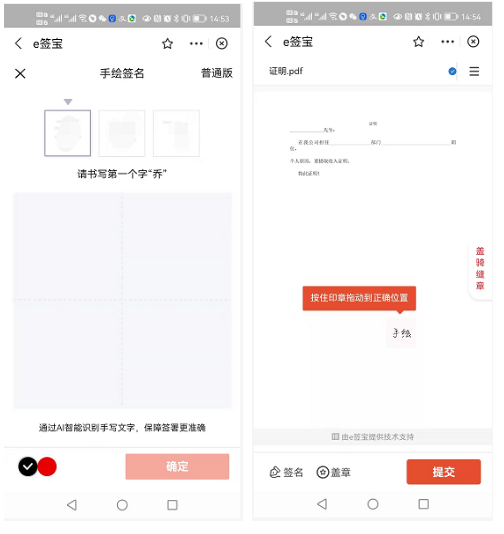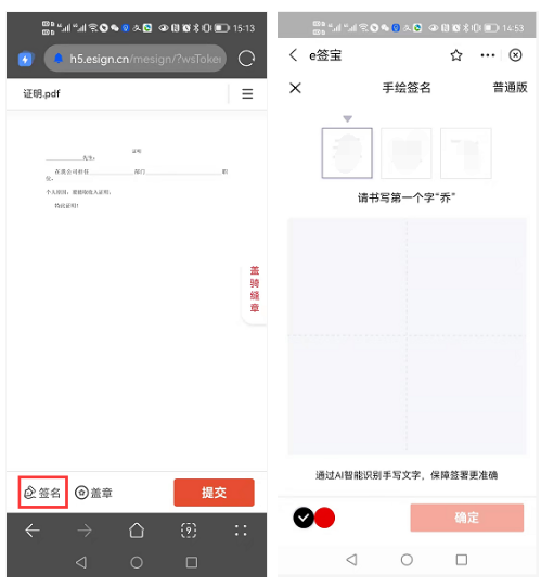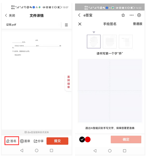 跳转e签宝App,根据提示打开App,如果没有安装,可以根据页面提示进行下载安装。点击【签名】会跳转到手绘页面,完成手绘签名后提交。