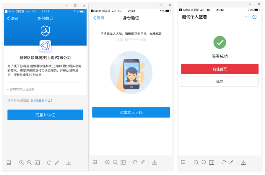 此时如果个人没有完成实名认证,提交签署后会跳转到个人实名认证页面;支付宝小程序签署默认唤起支付宝刷脸实名,如果完成过实名认证,此时做一次意愿认证。认证完成后也就签署完成了。