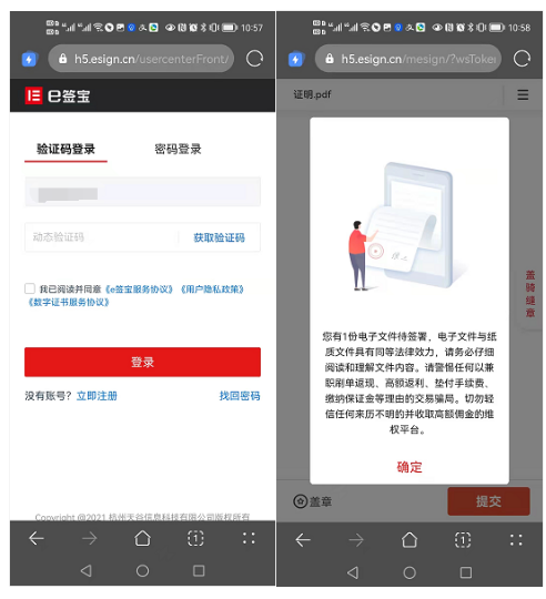通过手机H5页面签署,无需安装任何APP,首先进入登录页面,通过手机验证码登录e签宝,完成手绘签名以及提交。