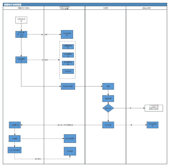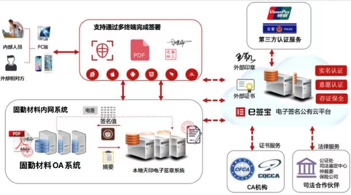 搭建统一的电子签章平台,对接固勤材料OA、电子合同以及其他业务系统,为固勤材料各业务系统提供可靠安全合法的电子签章服务,应用到电子合同、人事合同等文件的签署中。