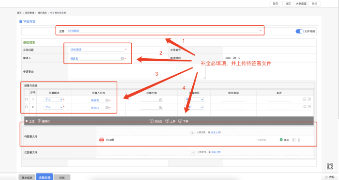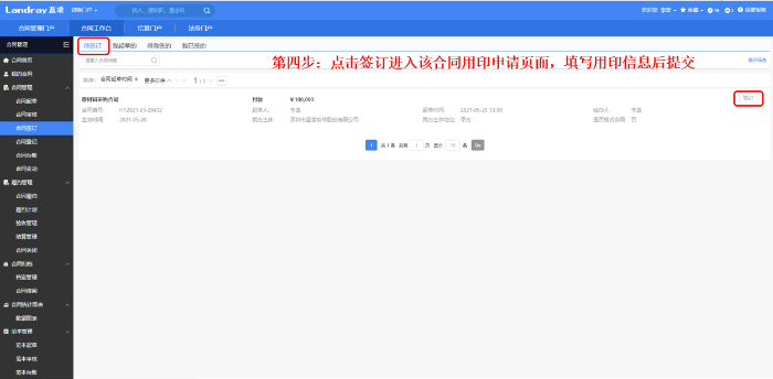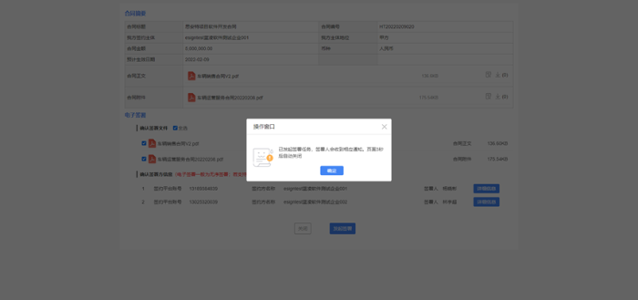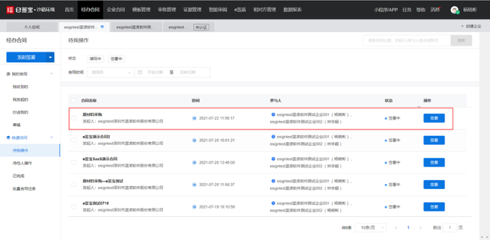 审批完成进入签署节点,签署过程有双方或者多方签署,以签署1为例,先完成签署任务,流程转至签署2完成签署。