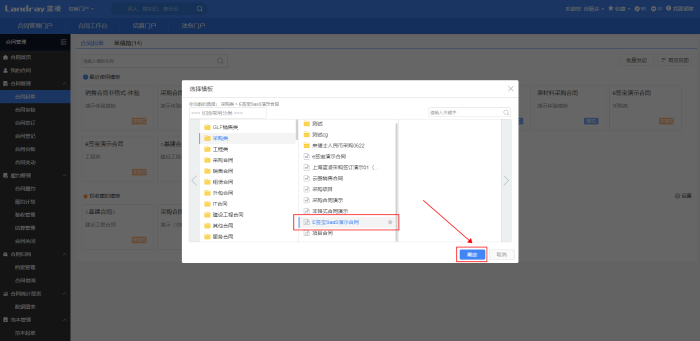 1、申请人找到对应的合同申请模板,点击【确定】进入合同起草页面,填写合同内容,完成合同的起草。