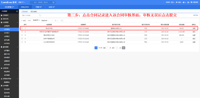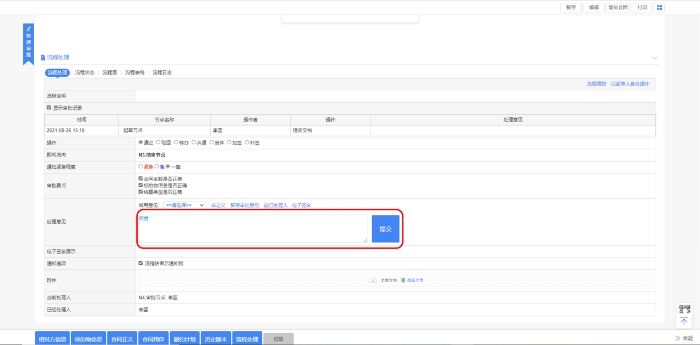 2、审批人找到对应合同记录进行审批提交。