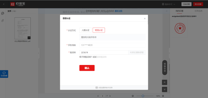 5、我方签署完,相对方联系人手机会收到签署通知,可以点击签署链接登录e签宝平台进行电子合同签署,后签的一方可以看到先签一方的盖章效果。操作同上。