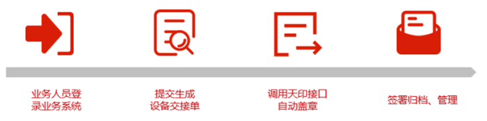 业务系统生成设备交接单,然后调用天印接口,传入关键字,自动盖章。