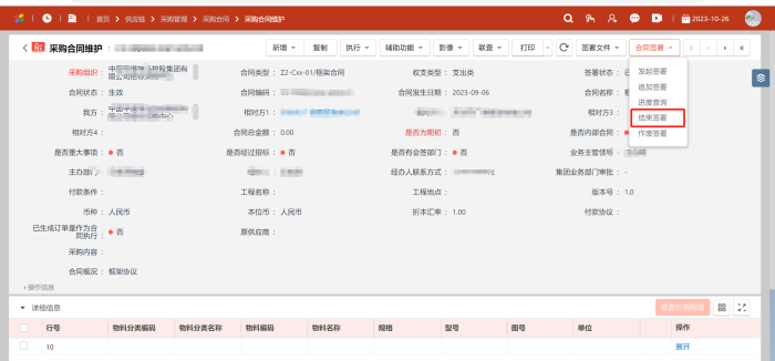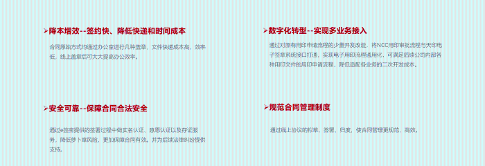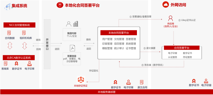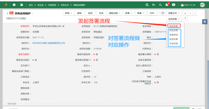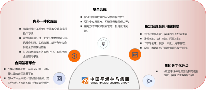 1、合同签署平台与ERP&合同管理平台实现了无缝对接,集团内部单位直接登陆NCC进行合同录入、审批、签字、签章等全流程线上操作。
