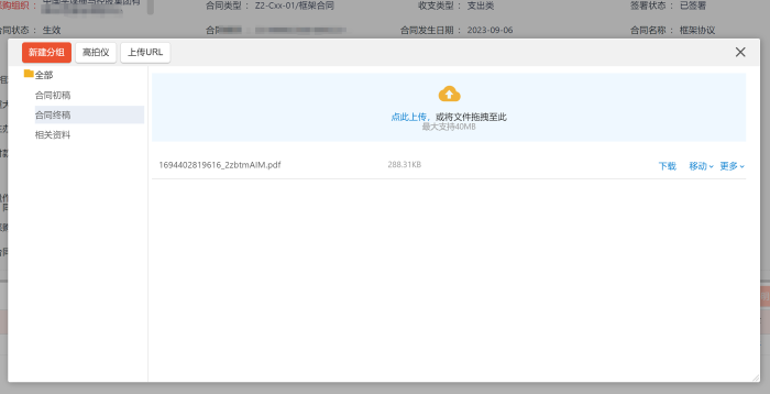 缺乏文档归档功能:目前NCC合同管理平台中,仅可以对单一合同,查看和预览合同上传文件或图片,无法统一对合同文档进行归档和调用。