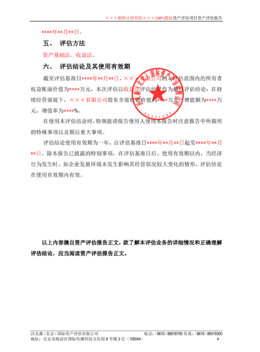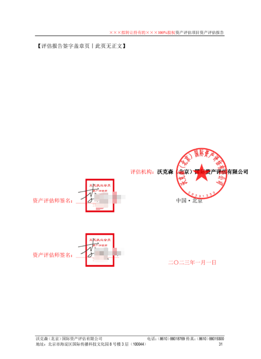 沃克森(北京)国际资产评估有限公司总部及各分支机构在报告出具过程中,通过在《评估云报告系统》中的流转环节发起“用印申请”,系统根据用印信息请求,向该报告的签字师(至少2名)推送签署信息及加密文档,该签字师(2名以上)采用会签方式,经过实名认证后签署评估师个人专用章并本人手签后,再由公司电子印章管理员加盖公司印章。要求根据文档类型在指定的签字盖章区域签署电子印章。
