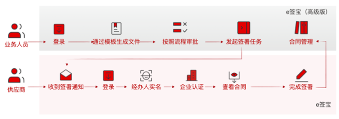 按照后台设置的审批流完成审批后触发给供应商进行签署,供应商完成实名认证后,可进行线下签署,签署完成后,合同统一归档到指定文件夹进行管理;